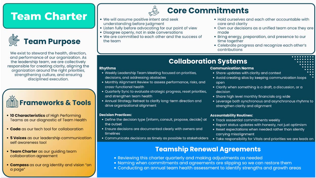 Hi Reader, Last week’s newsletter was about why your team needs a Charter. This week we dive deeper into each section, offering examples of each part to help your team start developing one. Think of your charter as the structured design work that every high-performing team does before they step onto the field. It is the intentional preparation that allows a group of talented leaders to operate as a unified team instead of a collection of individuals. In the absence of a charter, leadership...